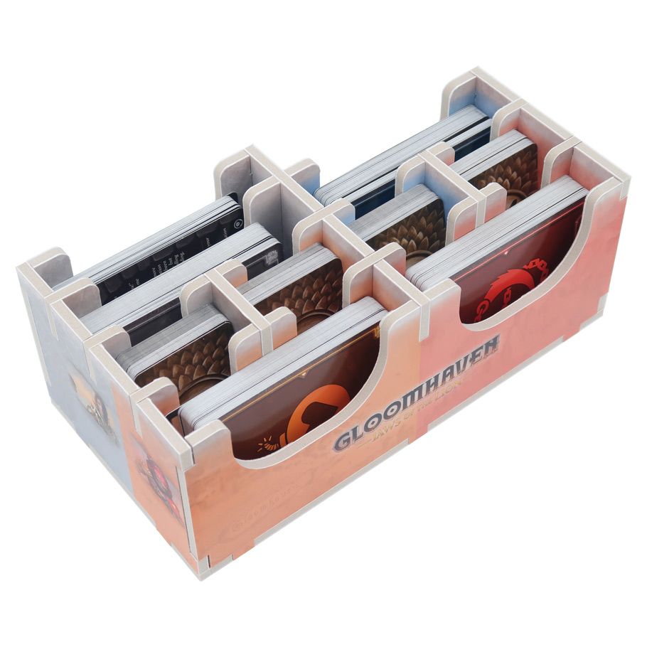 Insert compatible with Gloomhaven: Jaws of the Lion®. The design provides both efficient storage and improved game play. Many of the trays can be utilised during the game, and they greatly aid set-up and clear-away times. The boards and rule books act as a lid on top of the trays.