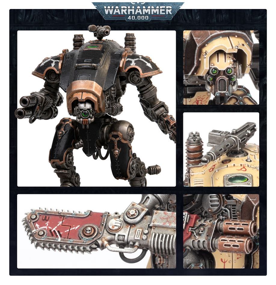 Nimble and responsive combat walkers, War Dog-class Knights act as hunting packs for their Dread Household. Stalking ahead of the terrible shadow cast by the larger Knights, the corrupt War Dogs guard flanks and devastate enemy scouts to keep their colossal masters from being surrounded, desperate to kill for the Ruinous Powers. Among these vicious engines, War Dog Huntsmen hunger to bring down hulking foes – their daemonbreath spear melts through the thickest armour, while chaintalons tear through organs and crew alike.