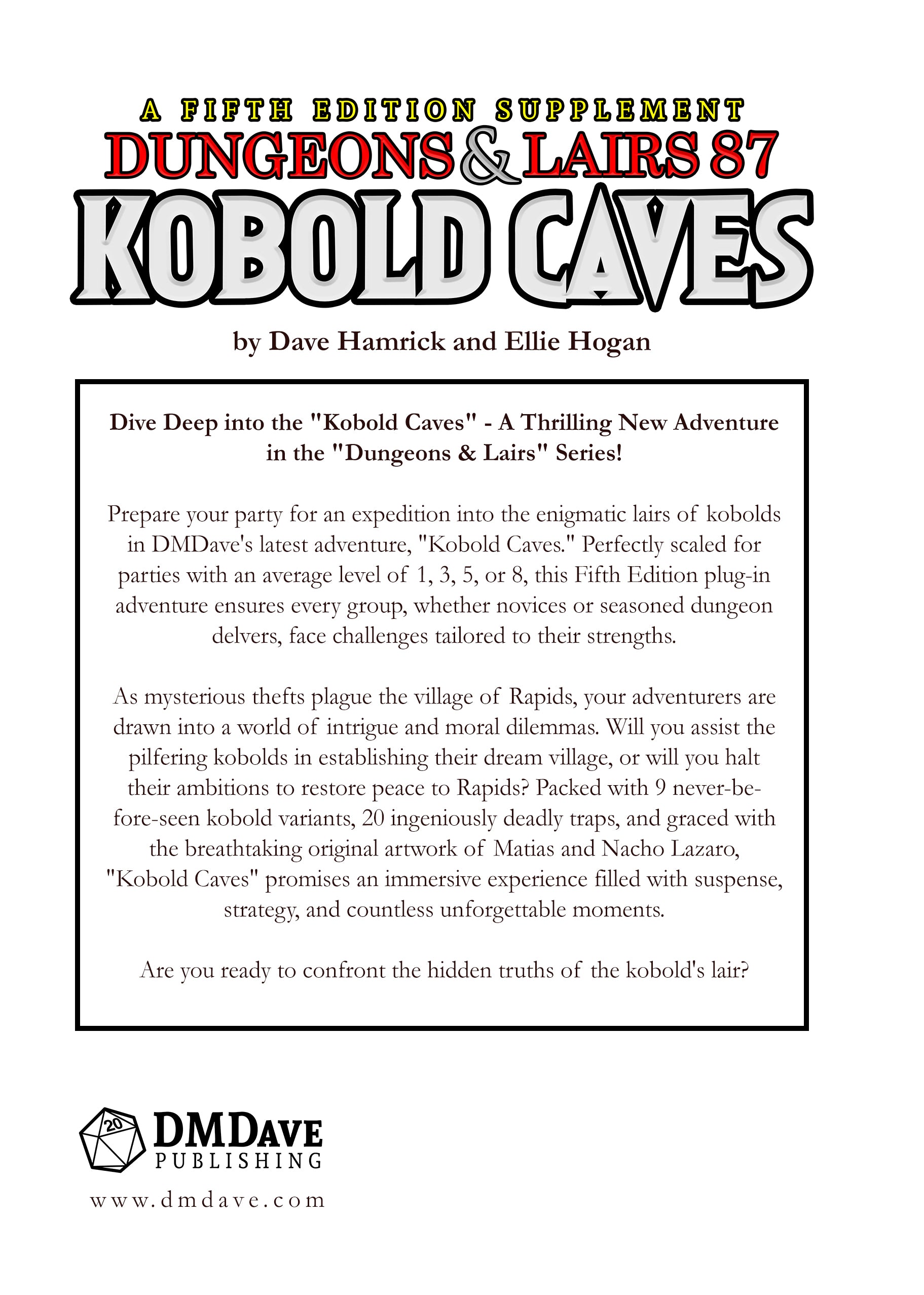 Prepare your party for an expedition into the enigmatic lairs of kobolds in DMDave's latest adventure, Kobold Caves. Perfectly scaled for parties with an average level of 1, 3, 5, or 8, this Fifth Edition plug-in adventure ensures every group, whether novices or seasoned dungeon delvers, faces challenges tailored to their strengths. As mysterious thefts plague the village of Rapids, your adventurers are drawn into a world of intrigue and moral dilemmas. Will you assist the pilfering kobolds in establishing their dream village, or will you halt their ambitions to restore peace to Rapids? Packed with 9 never-before-seen kobold variants, 20 ingeniously deadly traps, and graced with the breathtaking original artwork of Matias and Nacho Lazaro, Kobold Caves promises an immersive experience filled with suspense, strategy, and countless unforgettable moments.