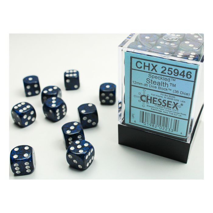 A 36-set Dice Block of 12mm d6 Speckled Stealth dice with white pips.
