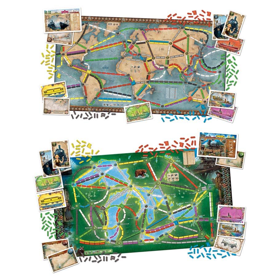 Ticket to Ride: Rails & Sails includes a double-sided game board, with one side showing the world and the other side showing the Great Lakes of North America. Players start with a differing number of cards and tokens depending on which side they play, and each side has a few differences in gameplay.